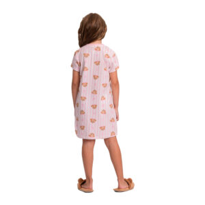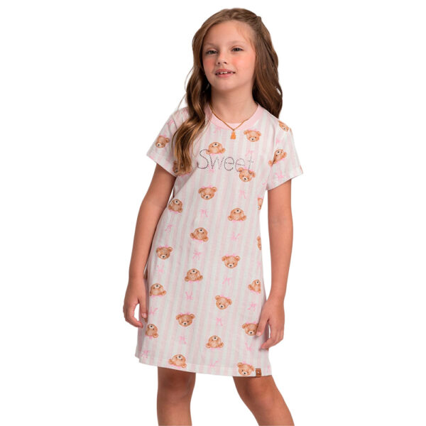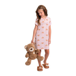 A camisola infantil do coordenado My Teddy é confeccionada em 100% algodão, oferecendo toque macio e frescor para noites agradáveis. O modelo possui manga curta, fundo listrado rosa e branco e estampa de urso teddy distribuída por toda a peça, criando um visual encantador e divertido. No centro da blusa, a palavra Sweet aparece em aplicação de strass, adicionando brilho delicado ao visual. Uma peça confortável e cheia de charme para as pequenas.