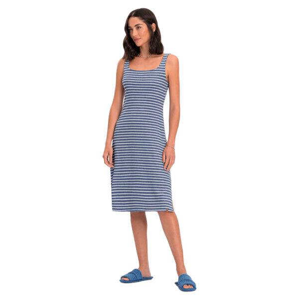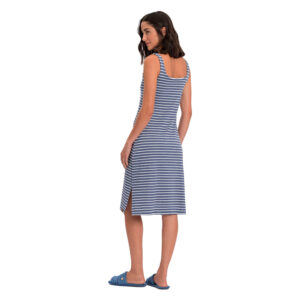 A camisola midi do coordenado Navy Homewear é ideal para quem busca conforto com estilo no dia a dia. Confeccionada em ribana canelada com listras azul e branca, ela tem caimento ajustado e leve. O decote quadrado valoriza o colo com um visual moderno, enquanto a abertura lateral na barra proporciona mais mobilidade. Um modelo versátil para descansar com liberdade e sofisticação em casa.