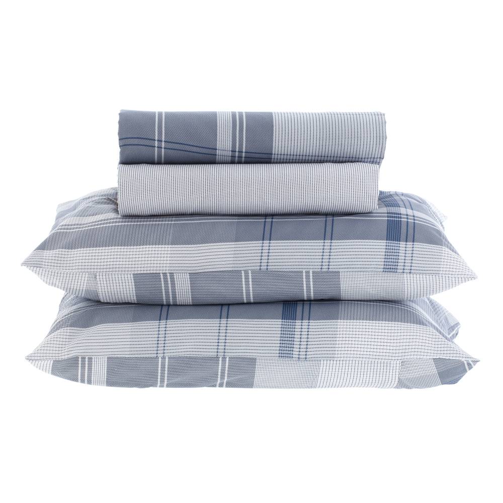 01 Lençol simples 2,40 x 2,40 m; 01 Lençol c/ elástico 1,58 x 1,98 x 0,38 m; 02 fronhas 50 x 70 cm