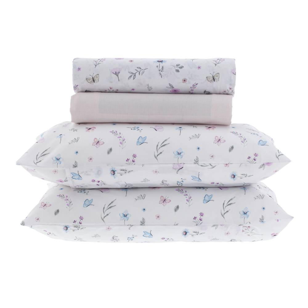 01 Lençol simples 2,40 x 2,40 m; 01 Lençol c/ elástico 1,58 x 1,98 x 0,38 m; 02 fronhas 50 x 70 cm