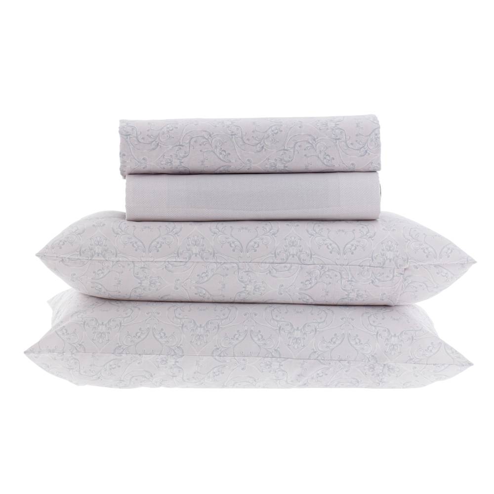 01 Lençol simples 2,40 x 2,40 m; 01 Lençol c/ elástico 1,58 x 1,98 x 0,38 m; 02 fronhas 50 x 70 cm