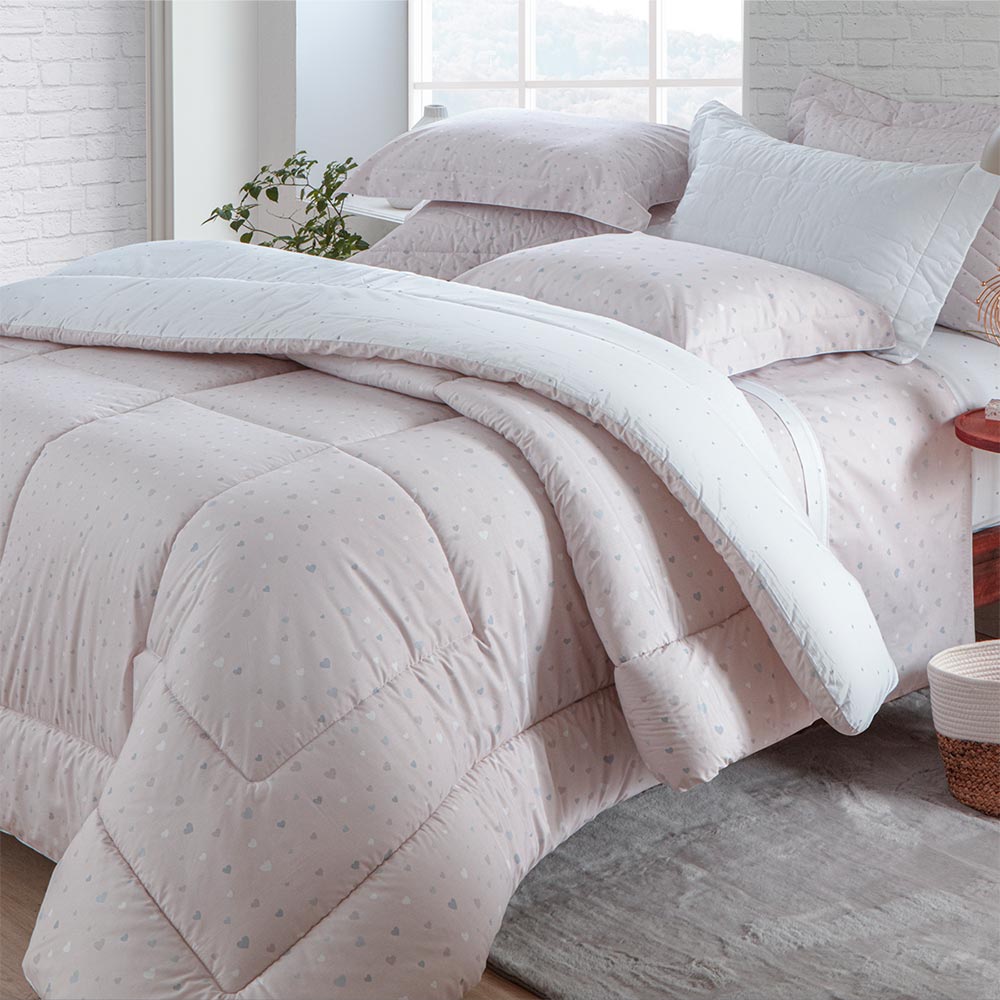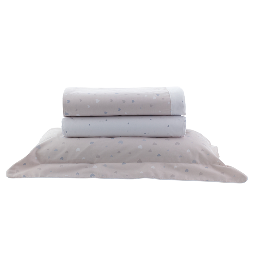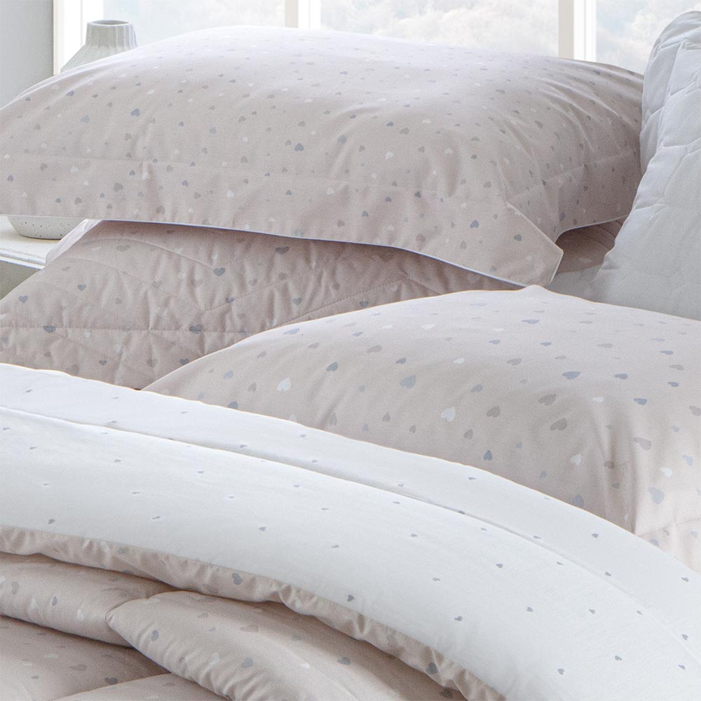 Os corações em tons de cinza sobre fundo rosa do desenho Amor trazem delicadeza para o quarto, com sua disposição leve os elementos dão um caimento perfeito a cama.