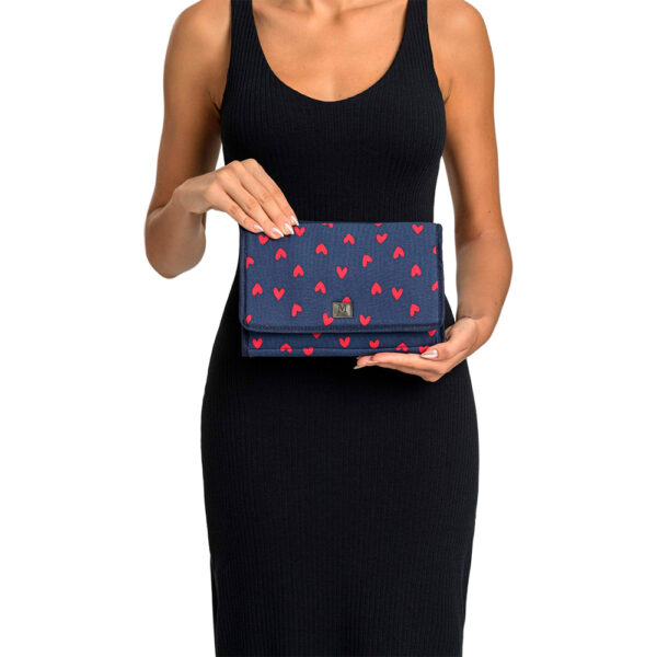 A Necessaire do coordenado Namorados traz uma proposta romântica e estilosa para os momentos de descanso. Na cor marinho, criando um toque especial e apaixonado, é estampado com corações vermelhos por toda a peça. Uma peça que une carinho e estilo, e pode ser combinada com a versão masculina para um conjunto de casal.