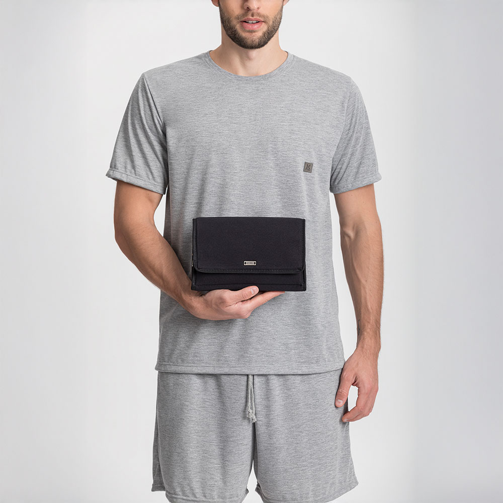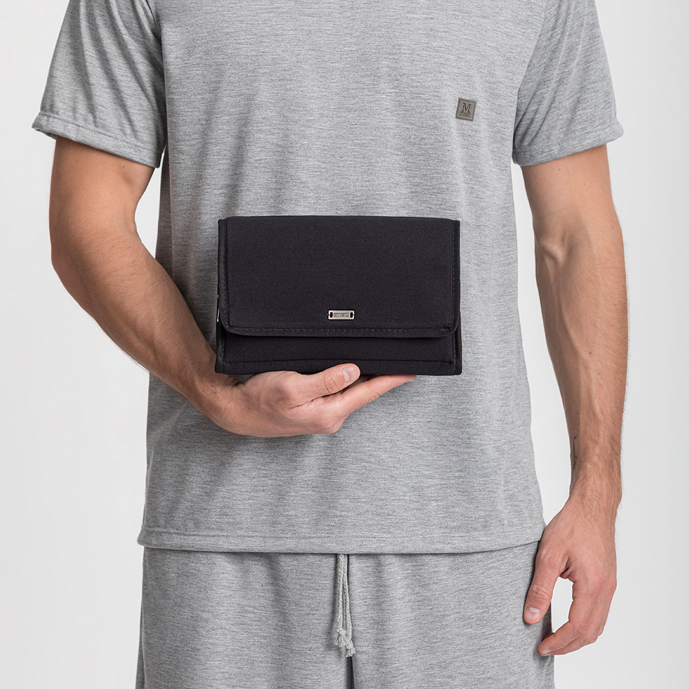 A necessaire um é item multifuncional e portátil do coordenado clube do Sofá. Ideal pra viagens e uso diário pois pode armazenar pequenos objetos e não ocupa muito espaço. Perfeita pra organizar seus itens na mala, pois acomoda escova de destes, pasta, protetor solar, pente, óculos, etc. Possui design compacto e funcional. Com porte mediano, ideal para levar na bolsa, mala ou mochila. Produzida na cor preta com abertura frontal que combina com vários estilos e com os pijamas da mesma linha.