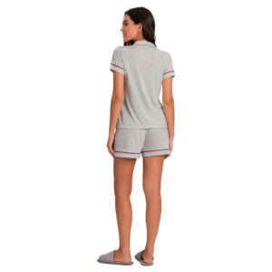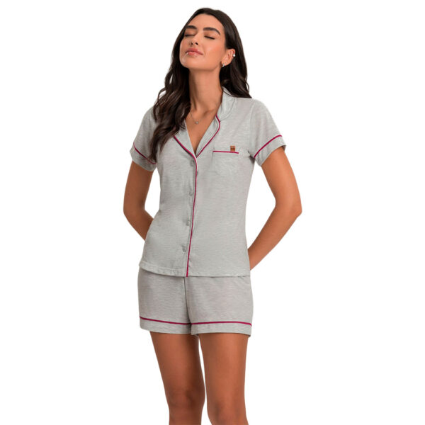 O pijama modelo americano do coordenado Color é confeccionado em malha 100% algodão. A blusa possui tom mescla, com abertura frontal com botões, gola tradicional, bolso funcional e acabamento com filete rosa nos contornos. O shorts mantém o mesmo estilo, também na cor mescla, com a barra finalizada em filete rosa. Uma composição leve e charmosa, ideal para noites confortáveis.