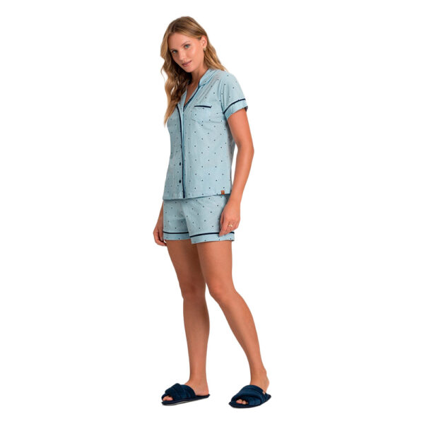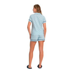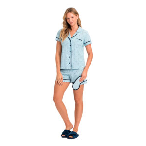 O pijama americano feminino do coordenado Onda de Felicidade traz o equilíbrio perfeito entre conforto, romantismo e sofisticação. Com modelagem clássica e abertura frontal por botões, a blusa listrada azul possui estampa delicada de corações, bolso funcional com detalhe em azul marinho e acabamentos na gola e mangas também em marinho, realçando o visual. O shorts segue a mesma proposta com listras e corações, além do acabamento contrastante nas barras. Confeccionado em 100% algodão, é uma excelente escolha para noites frescas e especiais.
