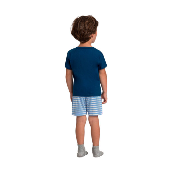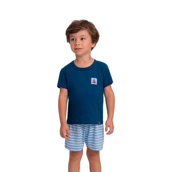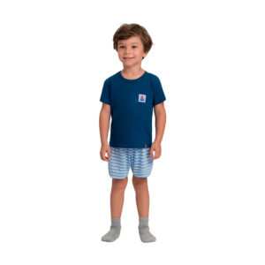 O pijama baby masculino do coordenado Amor de Verão é confeccionado com foco no bem-estar dos pequenos. A blusa azul marinho 100% algodão com estampa de barco garante conforto e respirabilidade. O shorts azul claro com listras é feito em tecido leve e macio, ideal para noites de sono agradáveis. Pode ser usado em conjunto com as versões adulto, juvenil e infantil para composições em família. Pijama baby masculino com blusa azul marinho 100% algodão e shorts listrado. Charme e frescor para o verão em família.