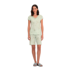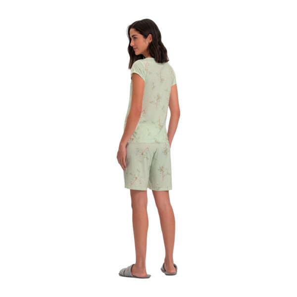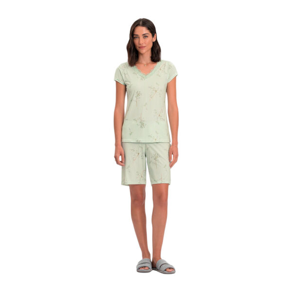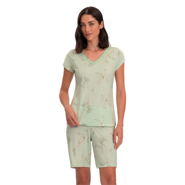 Pijama Manga Curta Feminino Listrado Verde com Estampa Floral