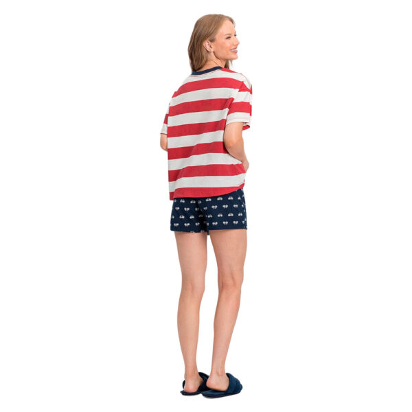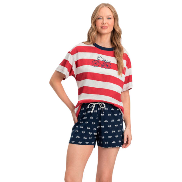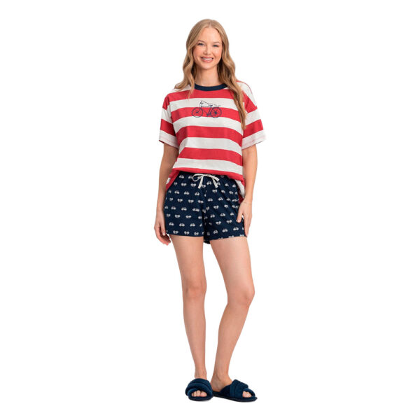 Pijama Manga Curta Feminino Listrado Vermelho e Branco com Estampa de Bicicleta