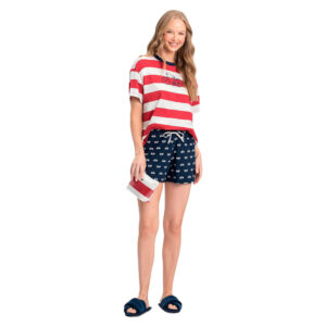 O pijama manga curta feminino do coordenado Pedalando Sonhos é confeccionado em 100% algodão. A blusa tem listras horizontais em vermelho e branco e estampa frontal de bicicleta. O shorts é marinho, com estampa de bicicletas por todo o tecido, cós com elástico e cordão decorativo no centro. Está disponível também em versão infantil, ideal para compor conjuntos coordenados entre mãe e filha.