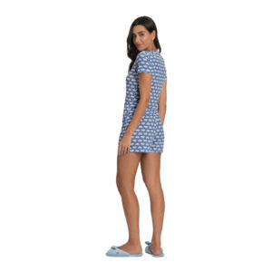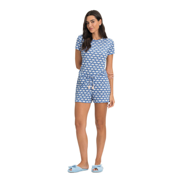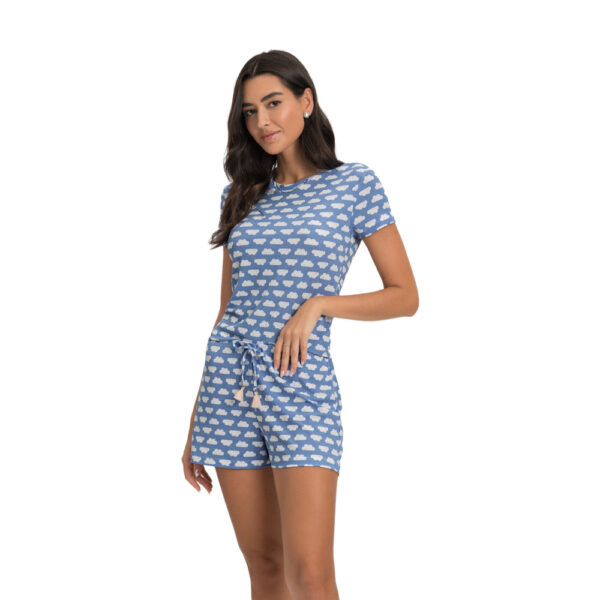 Pijama Manga Curta Feminino Ribana Canelada Azul com Estampa de Nuvens