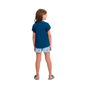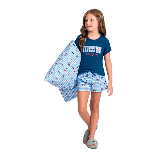 O pijama infantil do coordenado Amor de Verão traz frescor e descontração para as adolescentes. A blusa azul com estampa ¿Sea you soon¿ é feita em 100% algodão, oferecendo toque macio e respirabilidade. O shorts azul claro com listras brancas e estampa de verão, feito em meia malha, complementa o visual com leveza. Ideal para dias quentes, pode ser usado junto à versão adulta e baby para compor looks combinando em família. Pijama infantill azul com estampa de verão e shorts listrado com cordão. Frescor e diversão para as noites mais quentes.