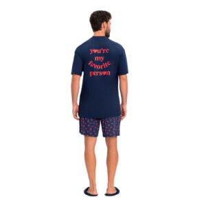 O pijama masculino do coordenado Namorados é confeccionado em 100% algodão, proporcionando conforto e respirabilidade para as noites de descanso. A blusa de manga curta na cor marinho tem modelagem tradicional e a frase “You’re my favorite person” estampada nas costas em vermelho . O shorts acompanha o conjunto com estampa de corações vermelhos sobre fundo marinho, criando um visual romântico e discreto. Pensado para ser usado em conjunto com a versão feminina, este pijama é ideal para casais que desejam momentos especiais com looks combinando.