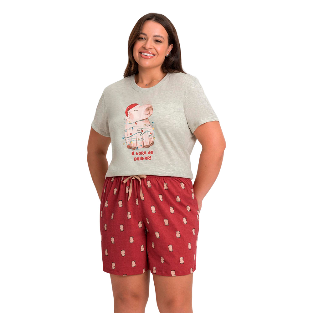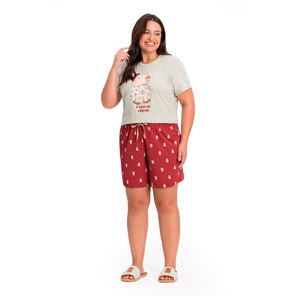 O pijama plus size do coordenado Natal das Capivaras celebra o clima natalino com conforto, estilo e um toque divertido. Confeccionado em meia malha, a blusa mescla traz estampa frontal da simpática capivara com gorro de Natal e a frase ¿É hora de brilhar¿, enquanto o shorts vermelho, em algodão, exibe estampa corrida de capivaras e cordão decorativo no cós. Ideal para criar momentos inesquecíveis com toda a família nas versões adulto, juvenil, infantil e baby.