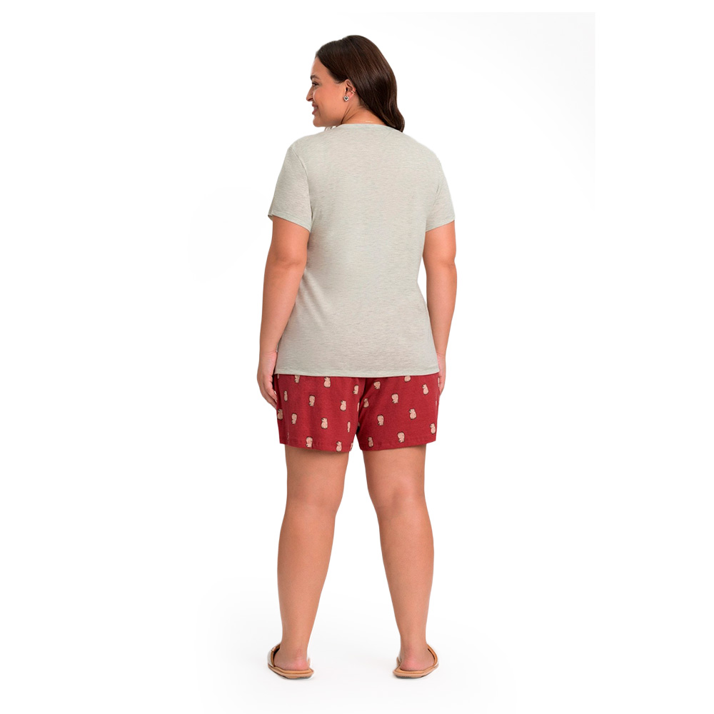 Pijama Manga Curta Plus Size Feminino Mescla e Vermelho com Estampa de Capivara