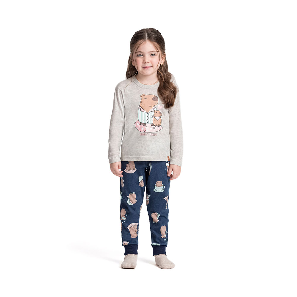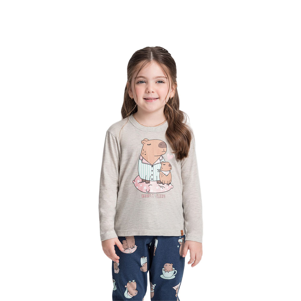 Pijama Manga Longa Baby Feminino Mescla Creme com Estampa Capivaras