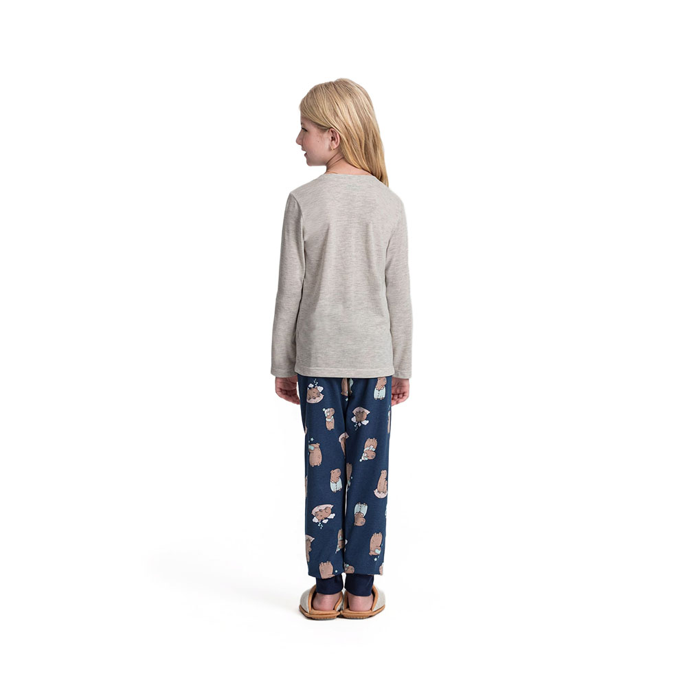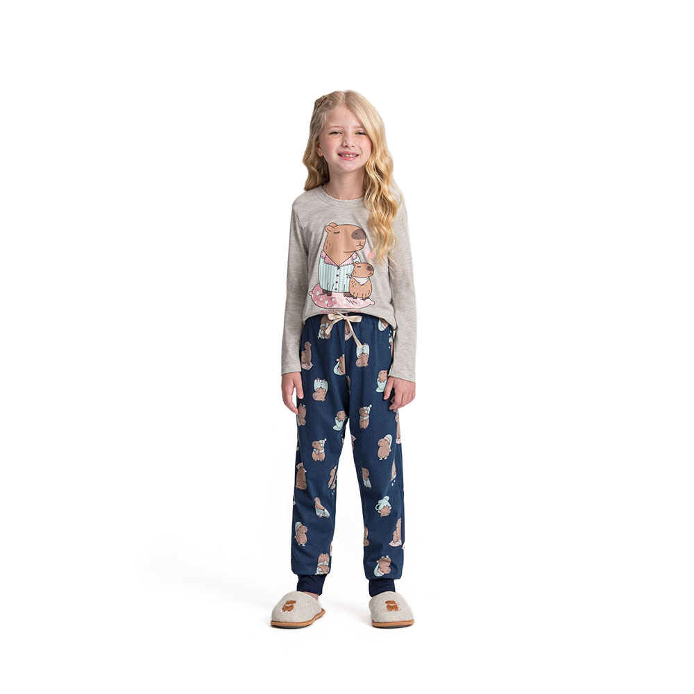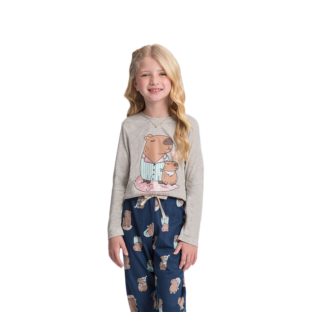 Pijama Manga Longa Infantil Feminino Mescla Creme com Estampa Capivaras