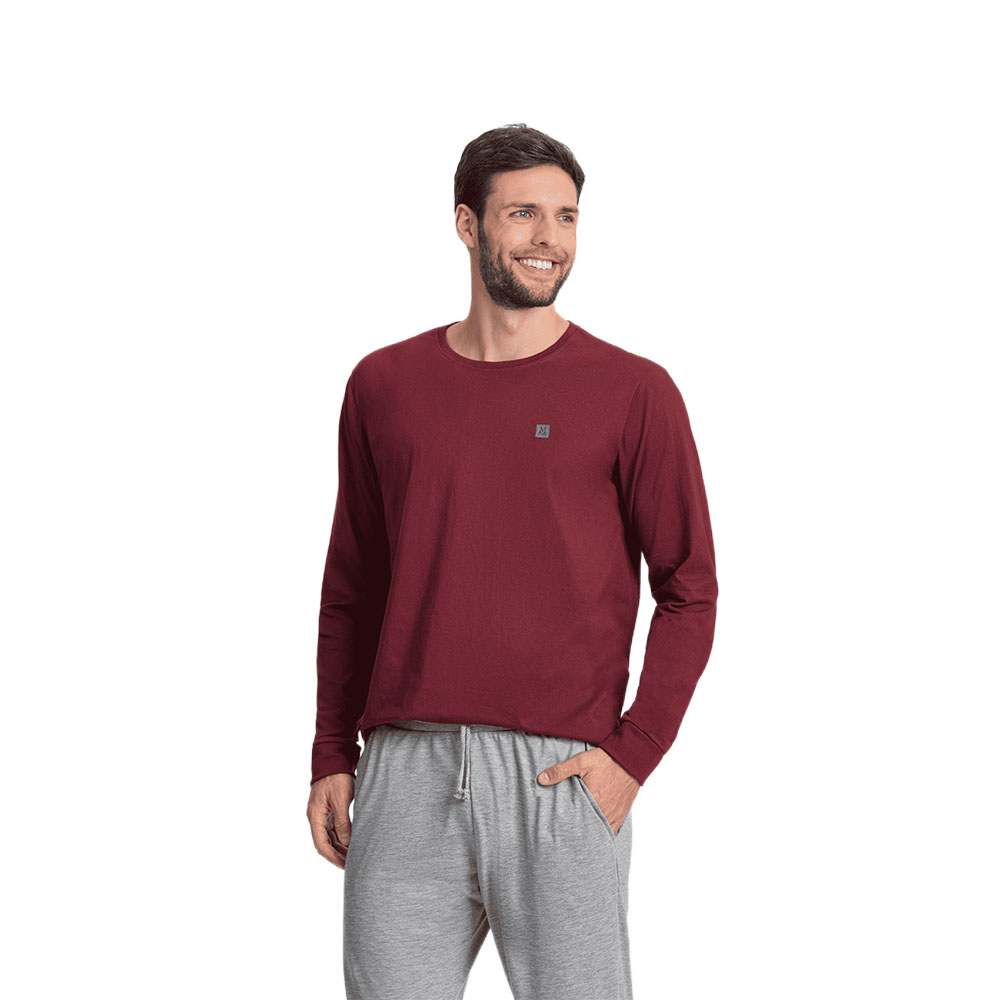 Este pijama masculino combina conforto e sofisticação para suas noites de descanso do coordenado Essencial. A blusa de manga longa na cor vinho traz um toque elegante e moderno, destacando-se pela etiqueta minimalista em corino ecológico. A calça cinza complementa o conjunto com elástico na cintura para ajuste perfeito e bolsos funcionais que garantem praticidade. Ideal para relaxar em casa com estilo e aconchego. Disponível também no modelo plus size.