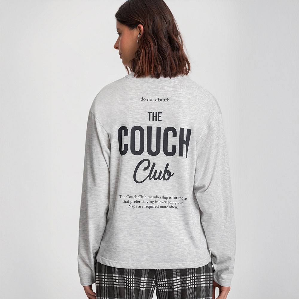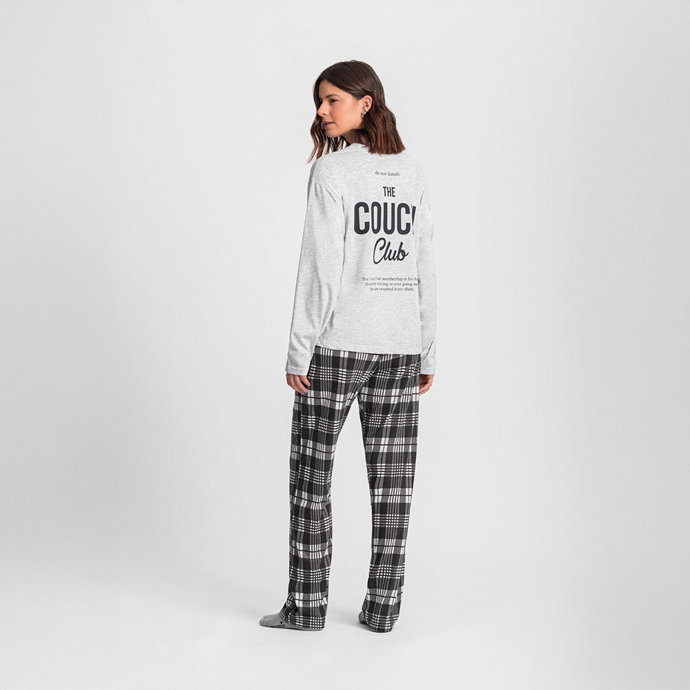 Adicione estilo e descontração às suas noites com o clichê perfeito para uma noite de filmes: um conjunto de pijamas para casal. A camiseta de manga longa é estilo oversized na cor cinza mescla e com estampa nas costas com a frase “The Couch Club”, perfeita para momentos de relaxamento a dois, trazendo um toque moderno e despojado ao visual. A calça xadrez completa o look, garantindo conforto e leveza para noites mais frias de descanso ou fins de semana preguiçosos no sofá. Essa linha de pijamas foi criada para casais que valorizam estilo e praticidade. Ideal para relaxar em casa, assistir a séries ou aproveitar momentos a dois, esse conjunto é o equilíbrio perfeito entre moda e funcionalidade.