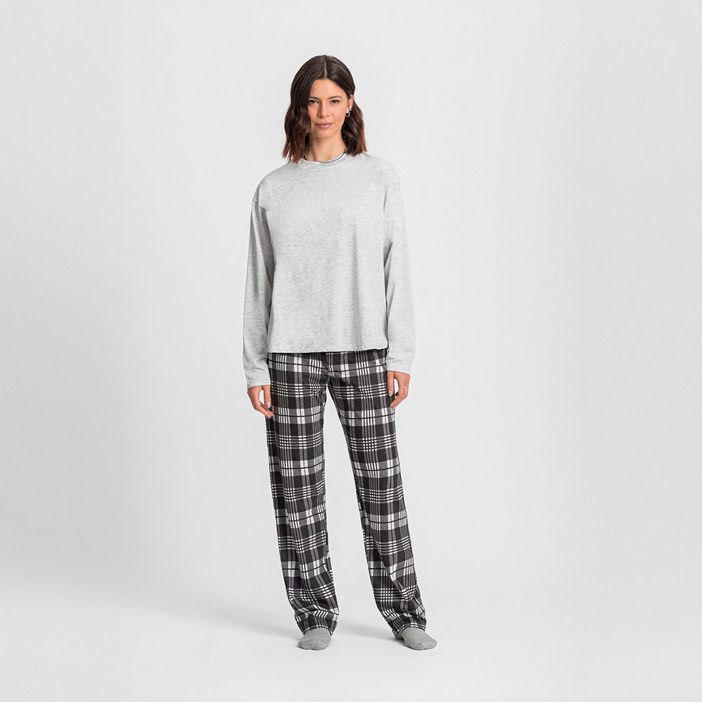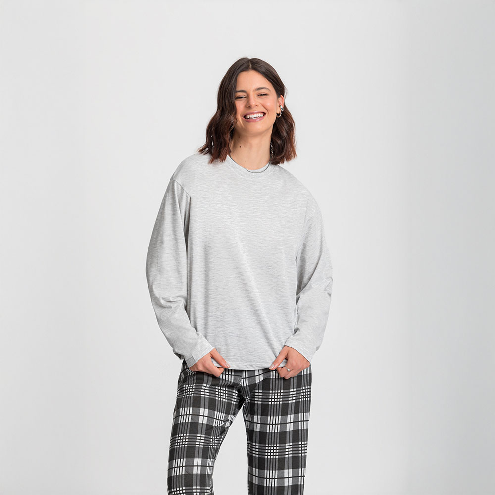 Pijama Manga Longa Oversized Feminino com Calça Xadrez