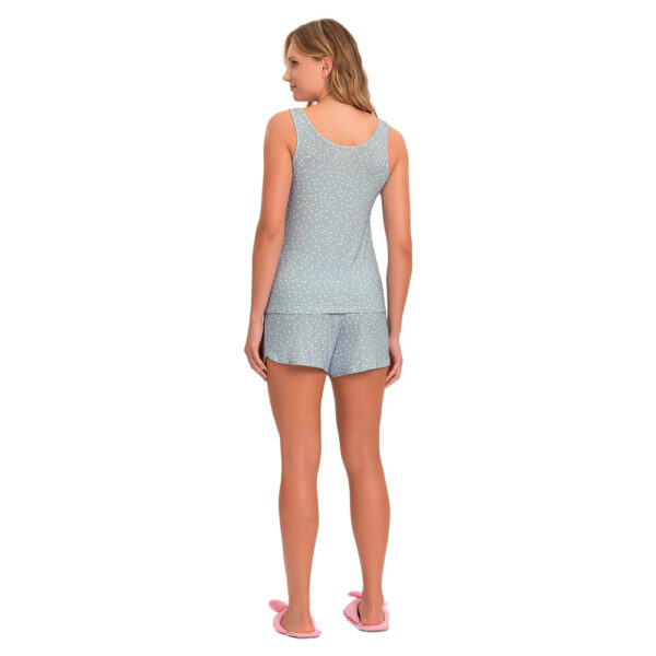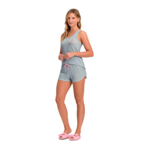 O pijama regata feminino do coordenado Serenidade é confeccionado em viscolycra com caimento suave e agradável. A blusa azul claro possui decote arredondado e estampa de pequenos corações, combinando com o shorts que traz a mesma estampa e acabamento com cós elástico e cordão decorativo. Uma opção charmosa para noites tranquilas e cheias de estilo.