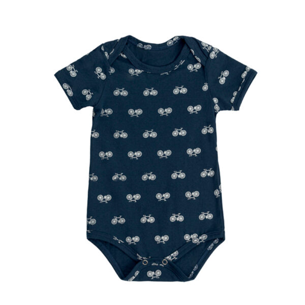 Estampa de bicicletas em fundo marinho Manga curta Gola redonda Abertura inferior com botões de pressão