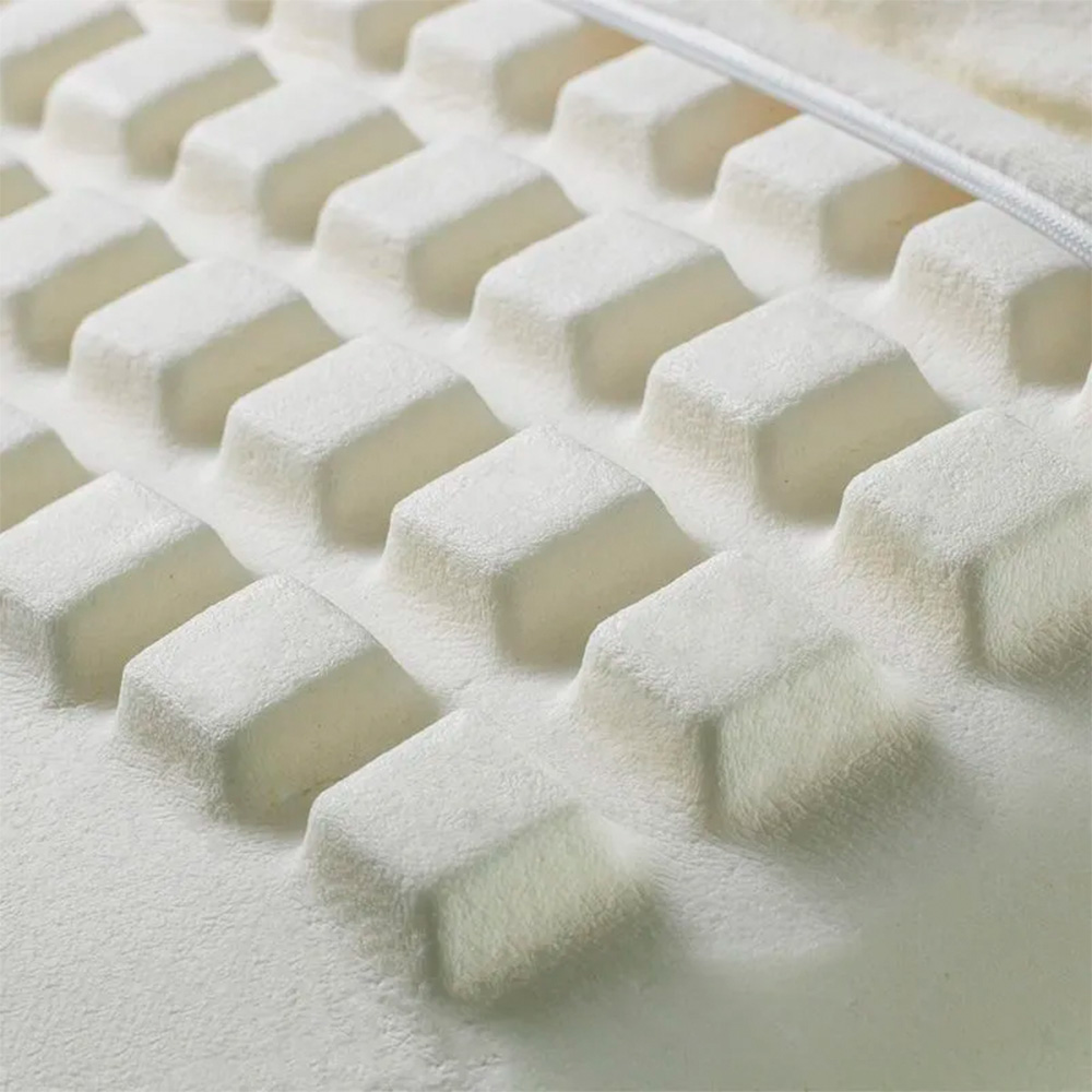 O design inovador deste travesseiro oferece duas faces! A face lisa oferece suporte ideal para o alinhamento perfeito da coluna, garantindo uma postura correta durante o sono. A face com blocos em alto relevo funciona como antirrugas, com pontos individuais que diminuem a pressão do travesseiro no rosto, melhorando a circulação sanguínea, prevenindo inchaços e rugas, e proporcionando uma sensação de frescor ao aumentar a circulação de ar entre a cabeça e o travesseiro.